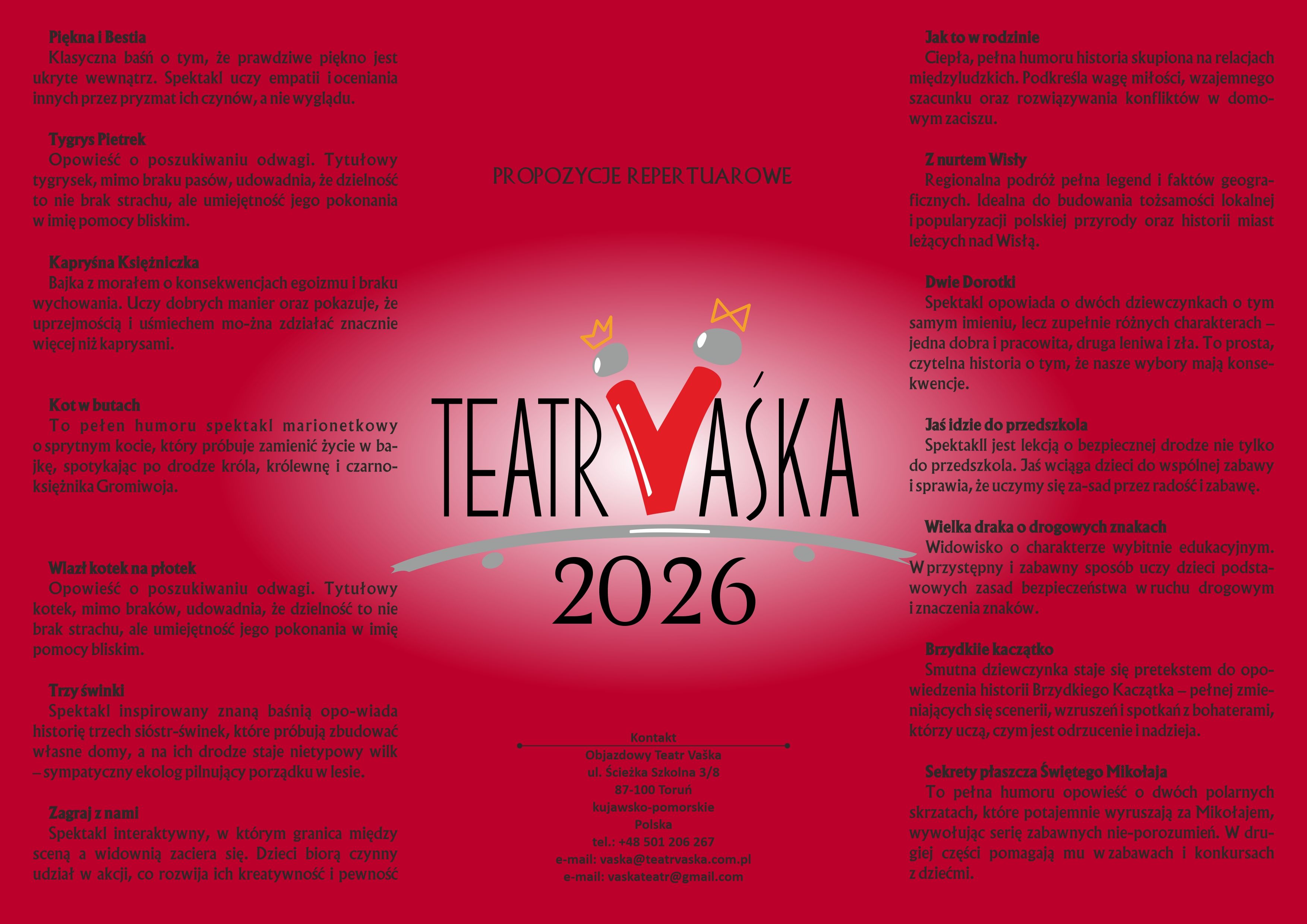 Znajdzie tu propozycje repertuarowe na cały rok 2026. z podziałem na okresy kiedy spektakle wprowadzane będą do repertuaru po premierach i wznowieniach. Ta sama ulotka stała się też naszym przewodnikiem po spektaklach w folderze repertuar, tu wzbogacona o mini animacje, które mamy nadzieje przyciągną naszych małych widzów. Ulotkę można pobrać i wydrukować lub zamówić telefonicznie bezpośrednio u nas. Wyślemy ją tradycyjnie, pocztą natychmiast po zamówieniu.